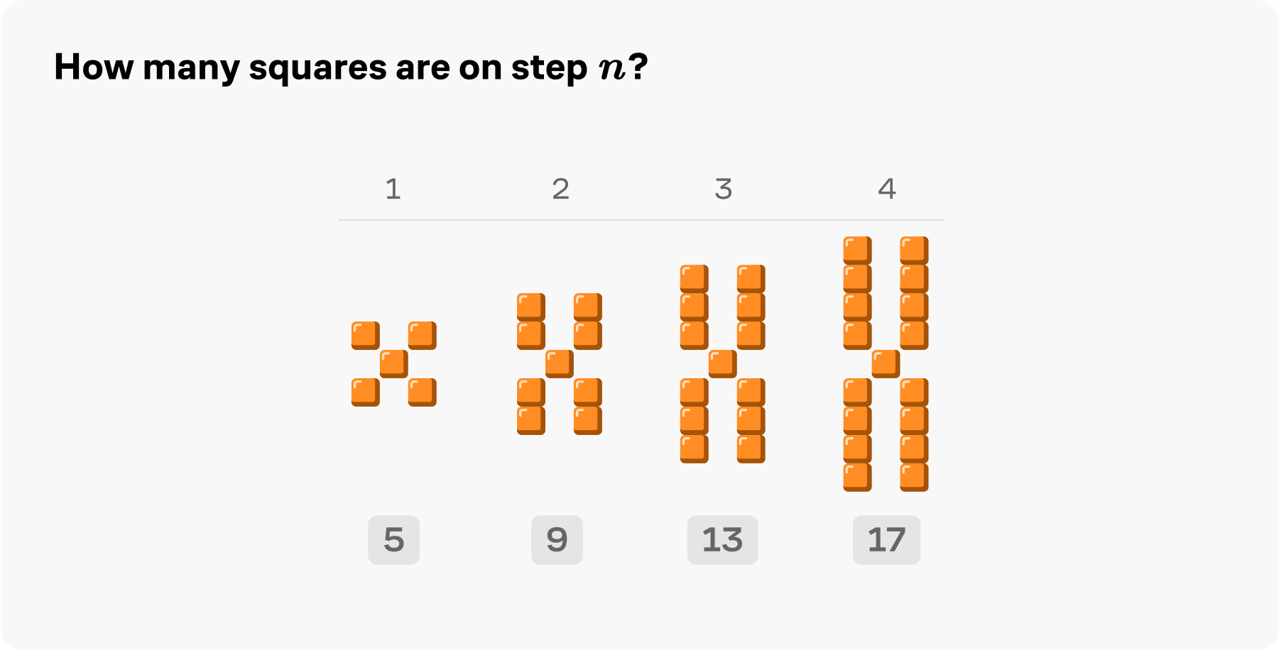 Take the expression \(3x + 5\): rather than solving an equation like \(3x+5=11\) you’ll use it to set up a pattern-making machine. Start with five blocks, add three at a time, and watch linear growth unfold.